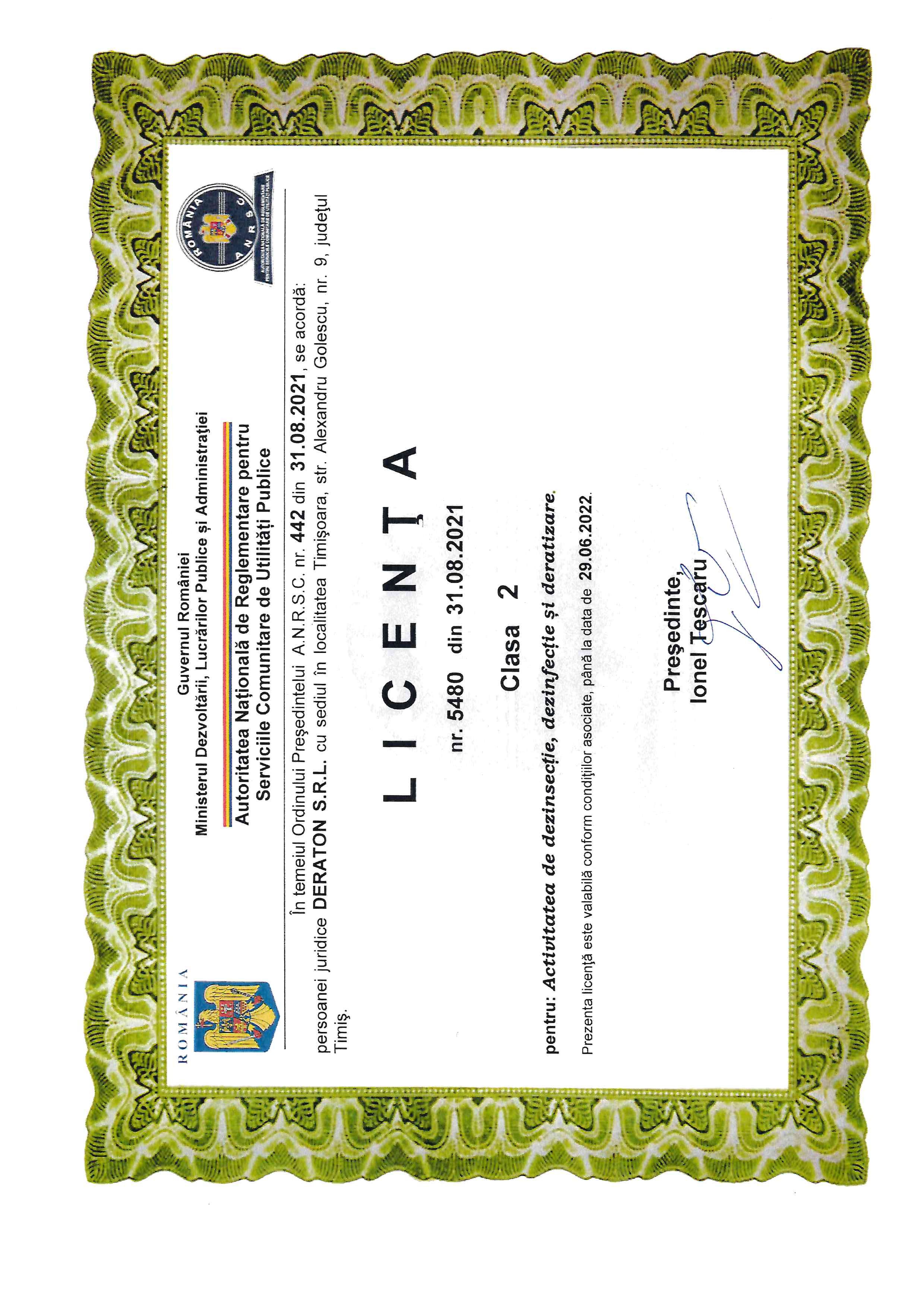 O data cu aderarea României la Uniunea Europeană, competiţia tot mai acerbă pe piaţa serviciilor DDD, împreună cu preocuparea permanentă pentru îmbunătăţirea serviciilor a determiant conducerea societăţii să treacă la implementarea sistemelor de manegement al calităţii ISO 9001, de managament de mediu ISO 14001, de management al sănătăţii şi securităţii în muncă OHSAS 18001 fiimd prima din Romania certificata. În plus compania a obţinut licenţă ANRSC clasa întâi în domeniul său de activitate şi autorizaţie de formare profesională în activitatea DDD organizind periodic cursuri de calificare in meseria de agent DDD si la aceste capitole fiind deschizatoare de drumuri, adica prima licentiata si autorizata. Intrucit in domeniul DDD nu exista un standard occupational si in consecinta angajatii nu puteau fi calificati , DERATON a fost initiatorea si coautoare impreuna cu Miniterul Muncii si Ministerul Educatiei a proiectului de implementare a Standardului Ocupational pentru meseria de Agent DDD, calificare recunoscuta si in UE.Deraton este autorizată de Direcţia de Sănătate Publică, Direcţia Sanitară Veterinară, Inspectoratul de Protecţie a Plantelor şi Carantină Fitosanitară, Serviciul Arme, Explozivi şi Substanţe Toxice şi Agenţia de protecţie a mediului pentru a executa operaţiuni DDD şi tratamente fitosanitare în orice localitate din România.